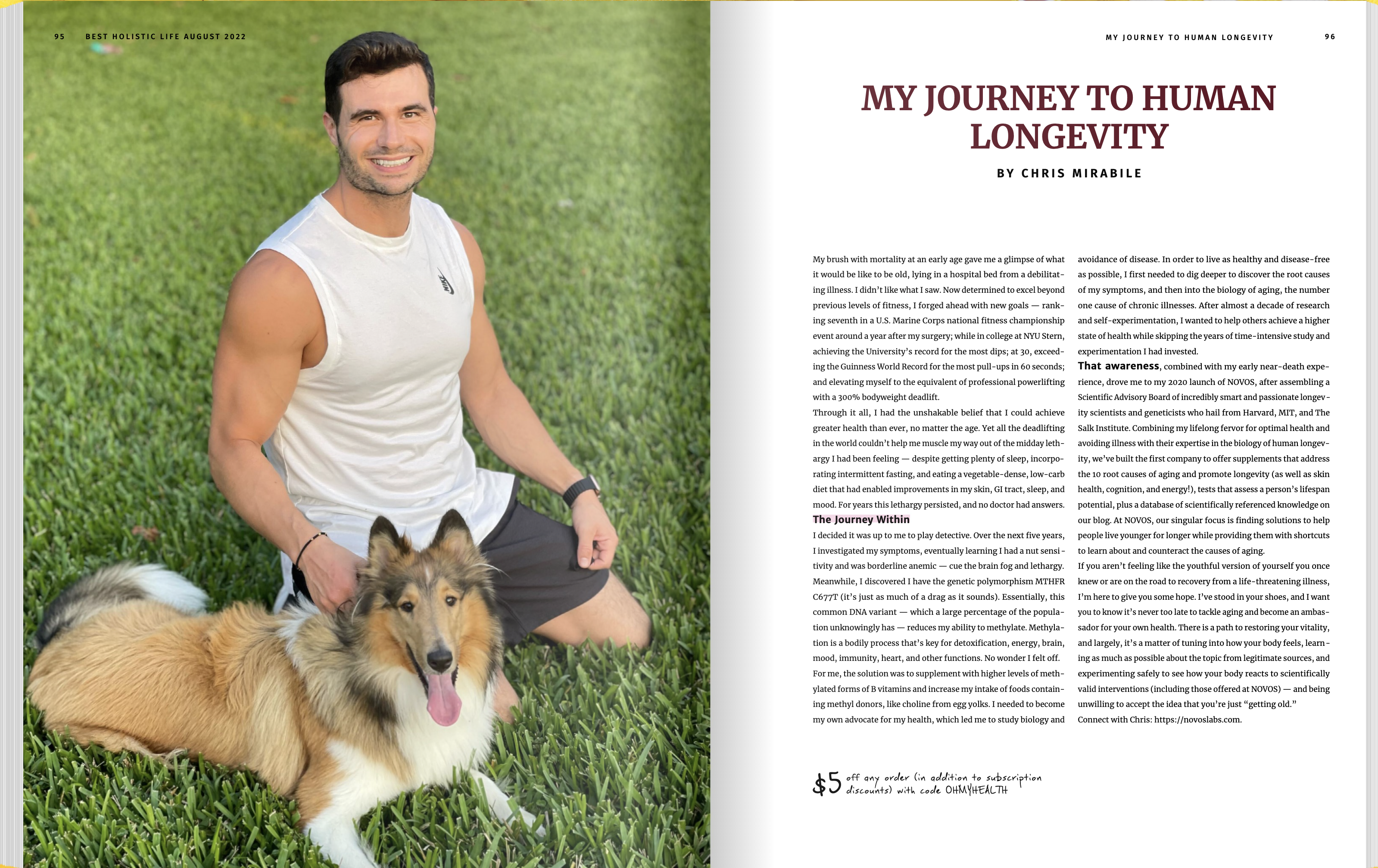 That awareness, combined with my early near-death experience, drove me to my 2020 launch of NOVOS, after assembling a Scientific Advisory Board of incredibly smart and passionate longevity scientists and geneticists who hail from Harvard, MIT, and The Salk Institute. Combining my lifelong fervor for optimal health and avoiding illness with their expertise in the biology of human longevity, we’ve built the first company to offer supplements that address the 10 root causes of aging and promote longevity (as well as skin health, cognition, and energy!), tests that assess a person’s lifespan potential, plus a database of scientifically referenced knowledge on our blog. At NOVOS, our singular focus is finding solutions to help people live younger for longer while providing them with shortcuts to learn about and counteract the causes of aging.
